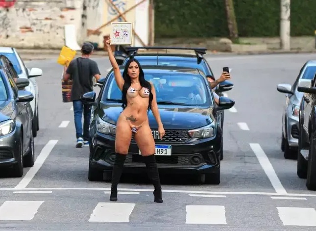 Mulher pelada protesta a favor de Lula e para o trânsito